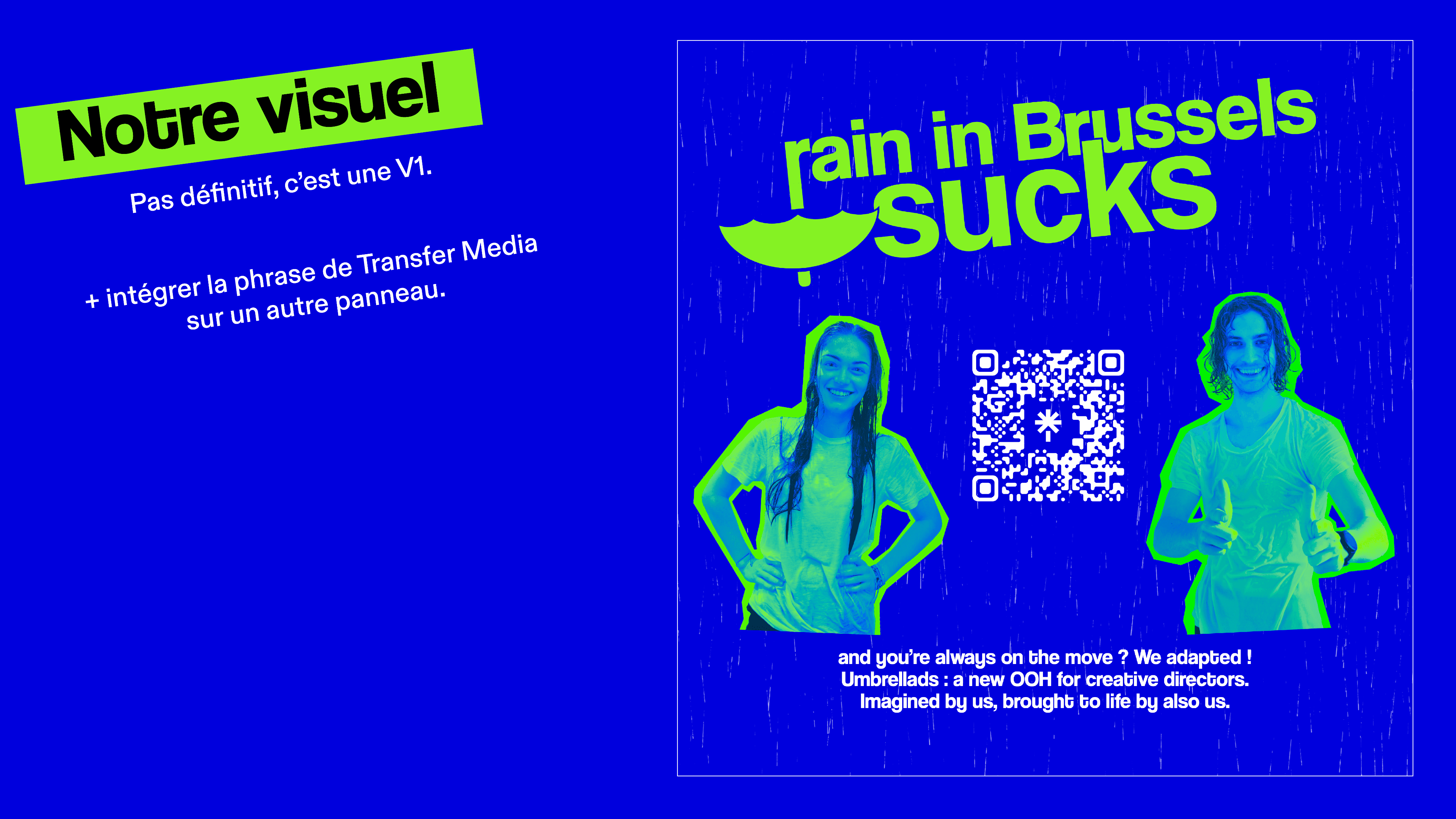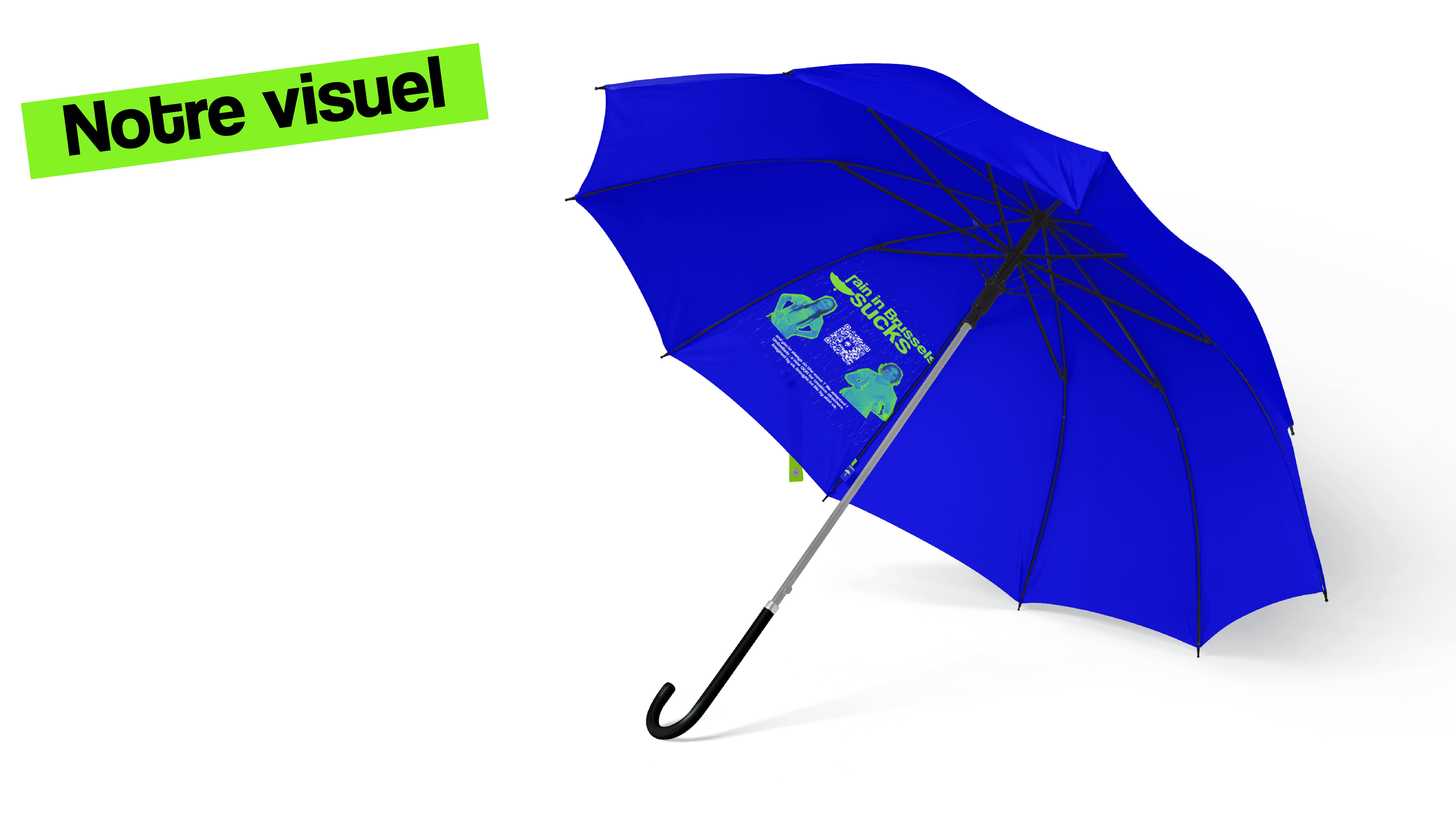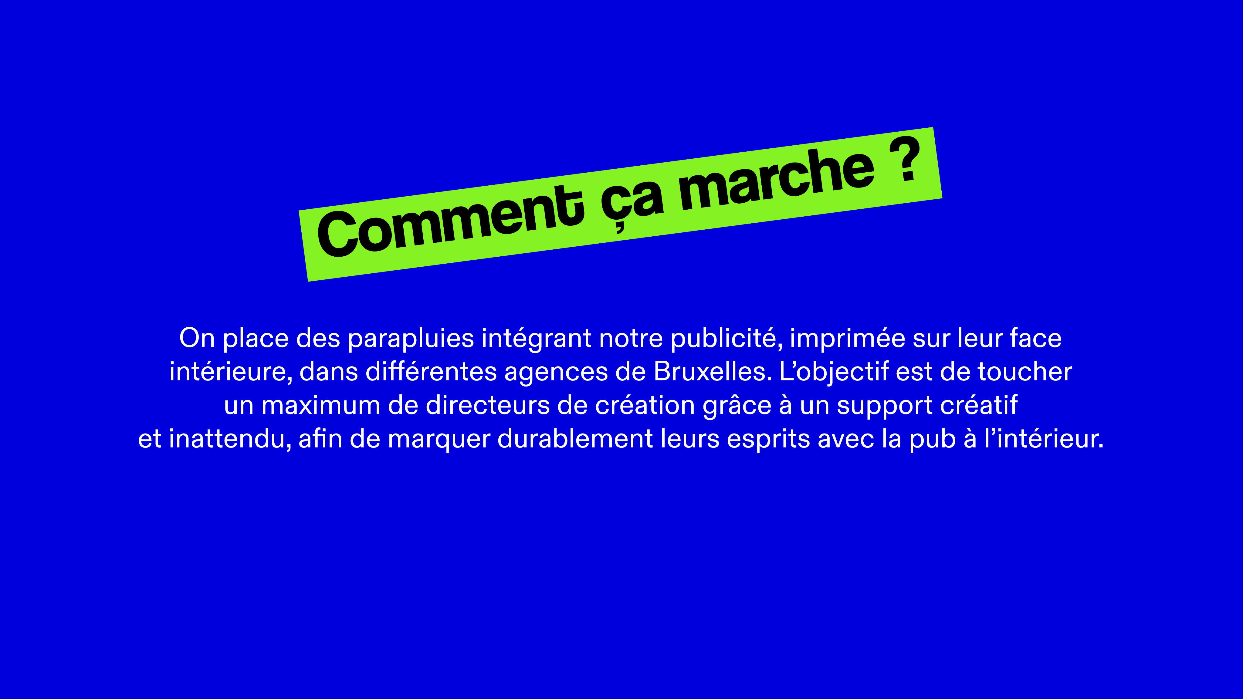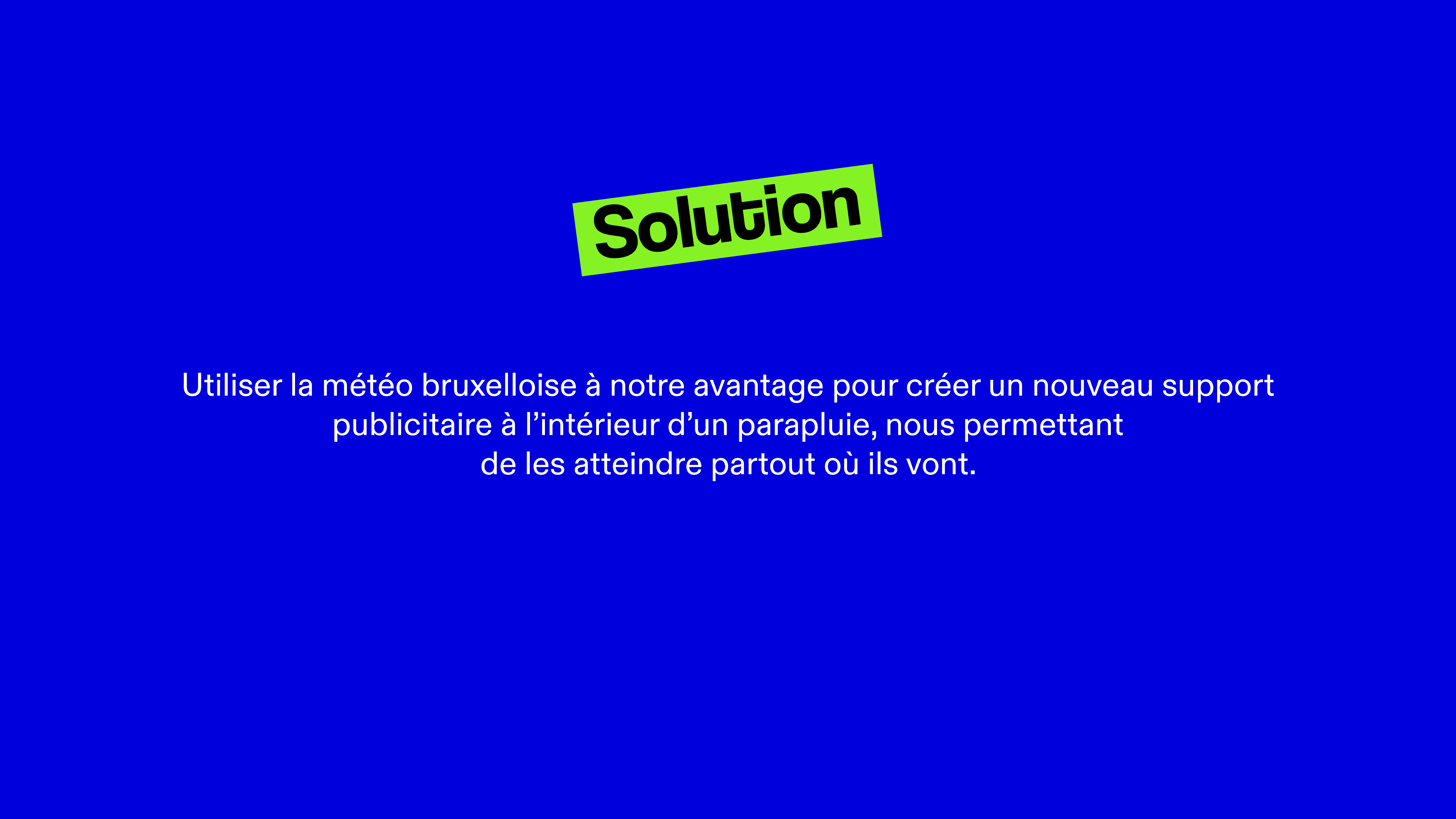 Utiliser la météo bruxelloise à notre avantage pour créer un nouveau support publicitaire à l’intérieur d’un parapluie, nous permettant de les atteindre partout où ils vont.